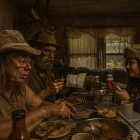 Rustic Room with Three Individuals Sharing a Meal