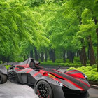 A sleek 2025 BAC Mono R sports car with a striking black and red design sits on a winding path surrounded by lush green trees, showcasing its aerodynamic lines and impressive craftsmanship.