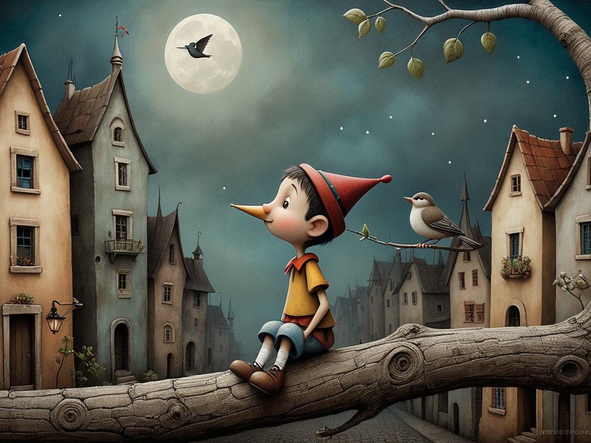 A whimsical scene depicts a young boy with a pointed nose, wearing a red hat, sitting on a tree branch. He gazes at a full moon, accompanied by a small bird, with charming houses in the background.