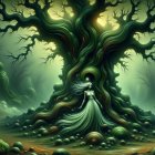 A woman in a flowing green dress stands gracefully by a towering, ancient tree covered in lush moss, surrounded by a mystical forest filled with soft, diffused light.