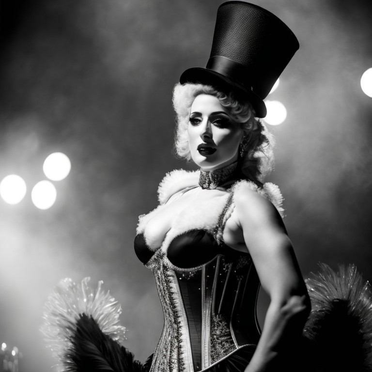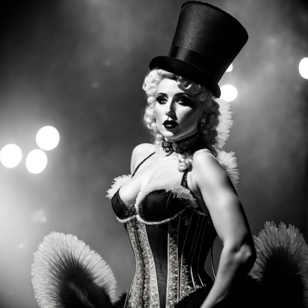 A monochrome image of a cabaret performer in a corset and top hat with stage lights behind.