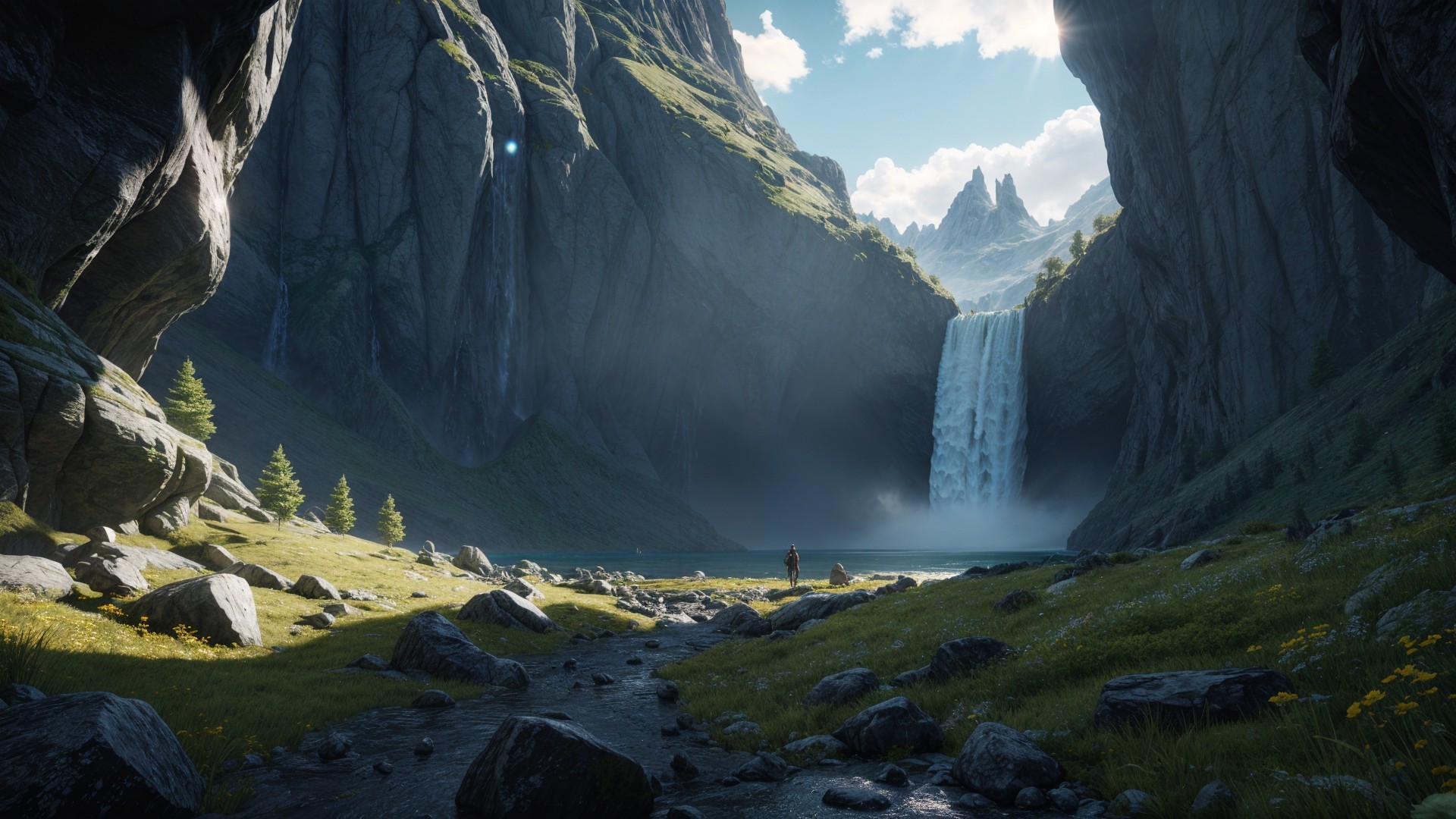 (Try from Vlad ThaDi ) - serene landscape features a majestic waterfall cascading into a tranquil lake, surrounded by towering cliffs and lush greenery. Soft sunlight illuminates the scene, enhancing its natural beauty.