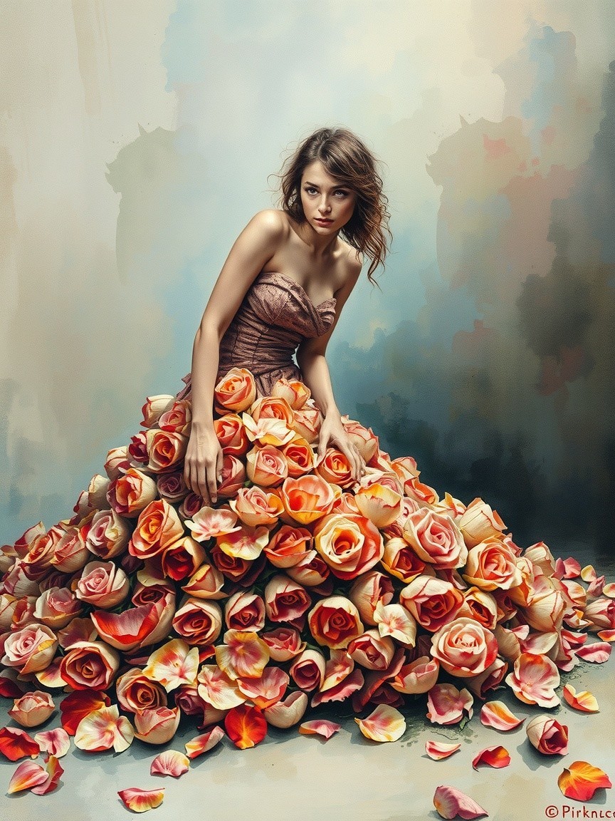 A woman sits gracefully in a stunning gown made of colorful petals, surrounded by scattered rose petals. Her expression is serene, complementing the dreamy, soft background.