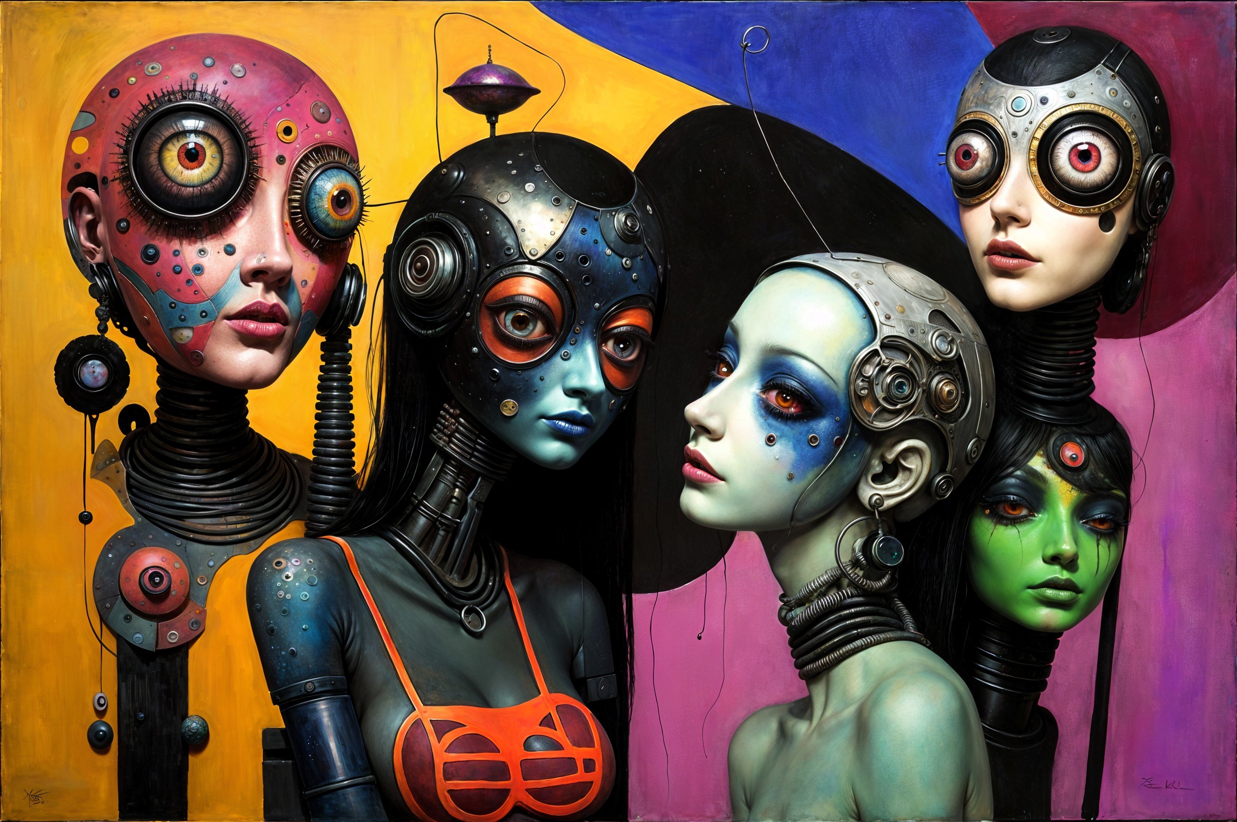 The image features four stylized, futuristic humanoid figures, each with unique colors and mechanical elements, set against a vibrant abstract background, blending art and technology.