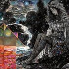 A serene woman adorned with a floral crown sits amidst a dreamlike landscape, surrounded by geometric shapes and a starry sky, evoking a sense of tranquility and mystery.