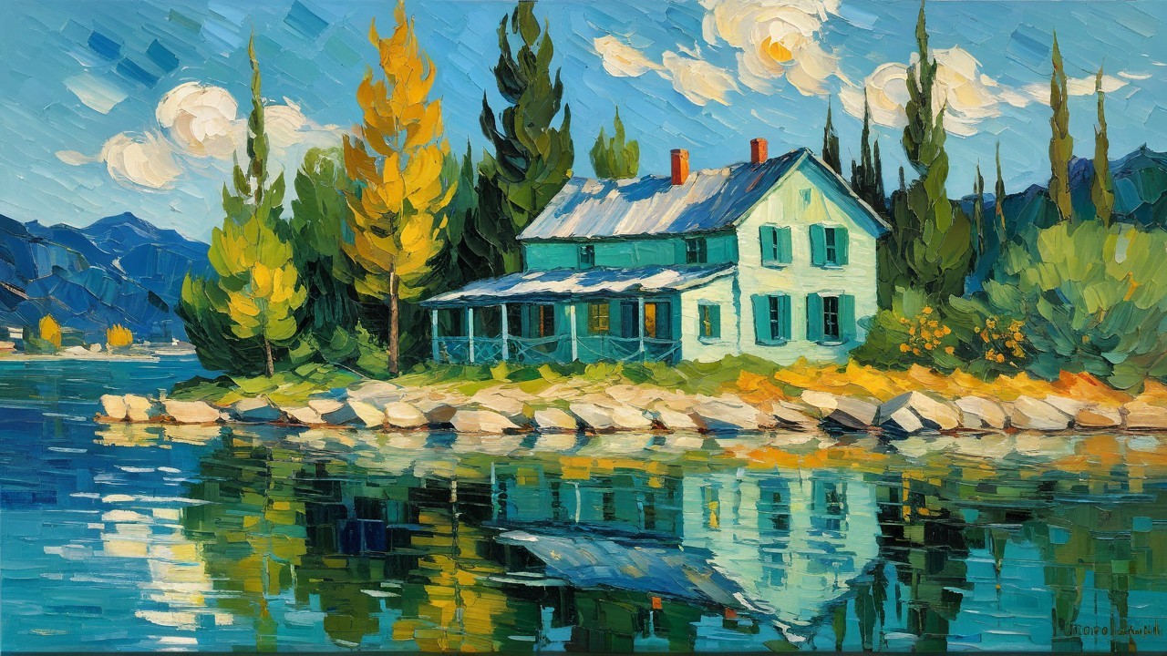 A vibrant oil painting captures a serene landscape with a quaint house nestled by a tranquil lake. The house, painted in shades of off-white with a turquoise roof and shutters, stands prominently on the right side of the canvas. Its reflection shimmers on the water's surface, creating a mirror image