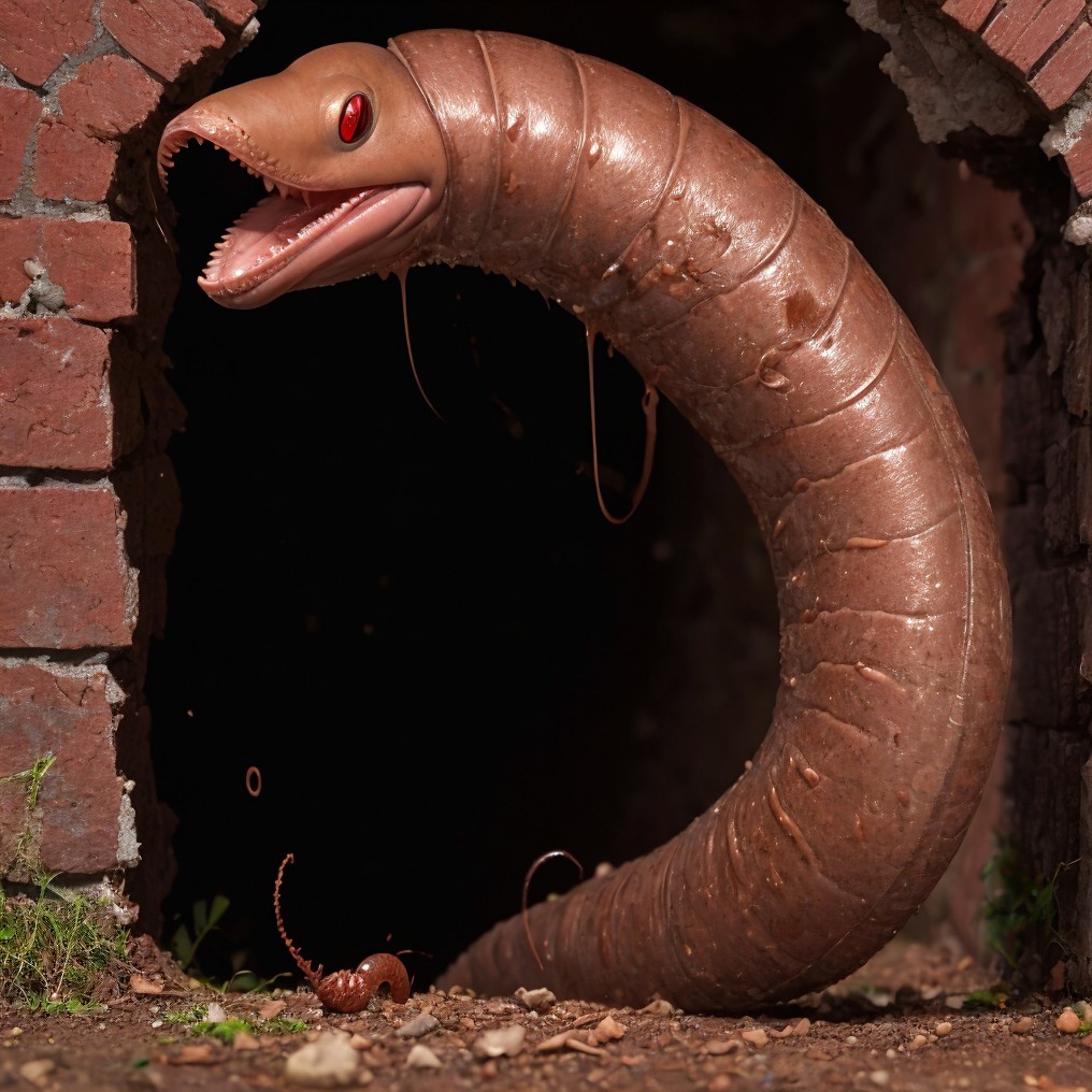 Prompt: "An earthworm tearing through the wall and slurping ferociously, with its squiggly front end extending out of the wall, ultra-realistic image."