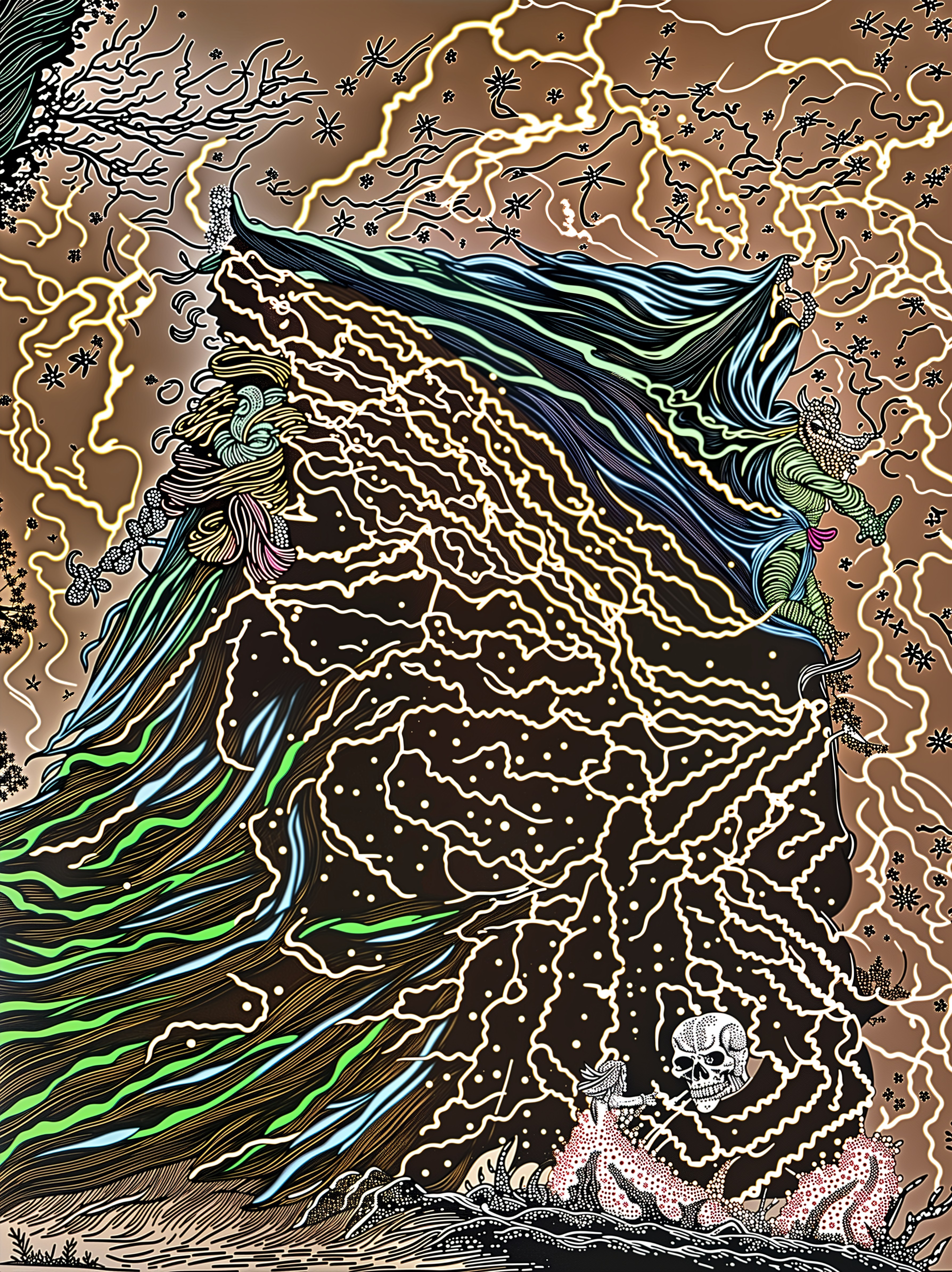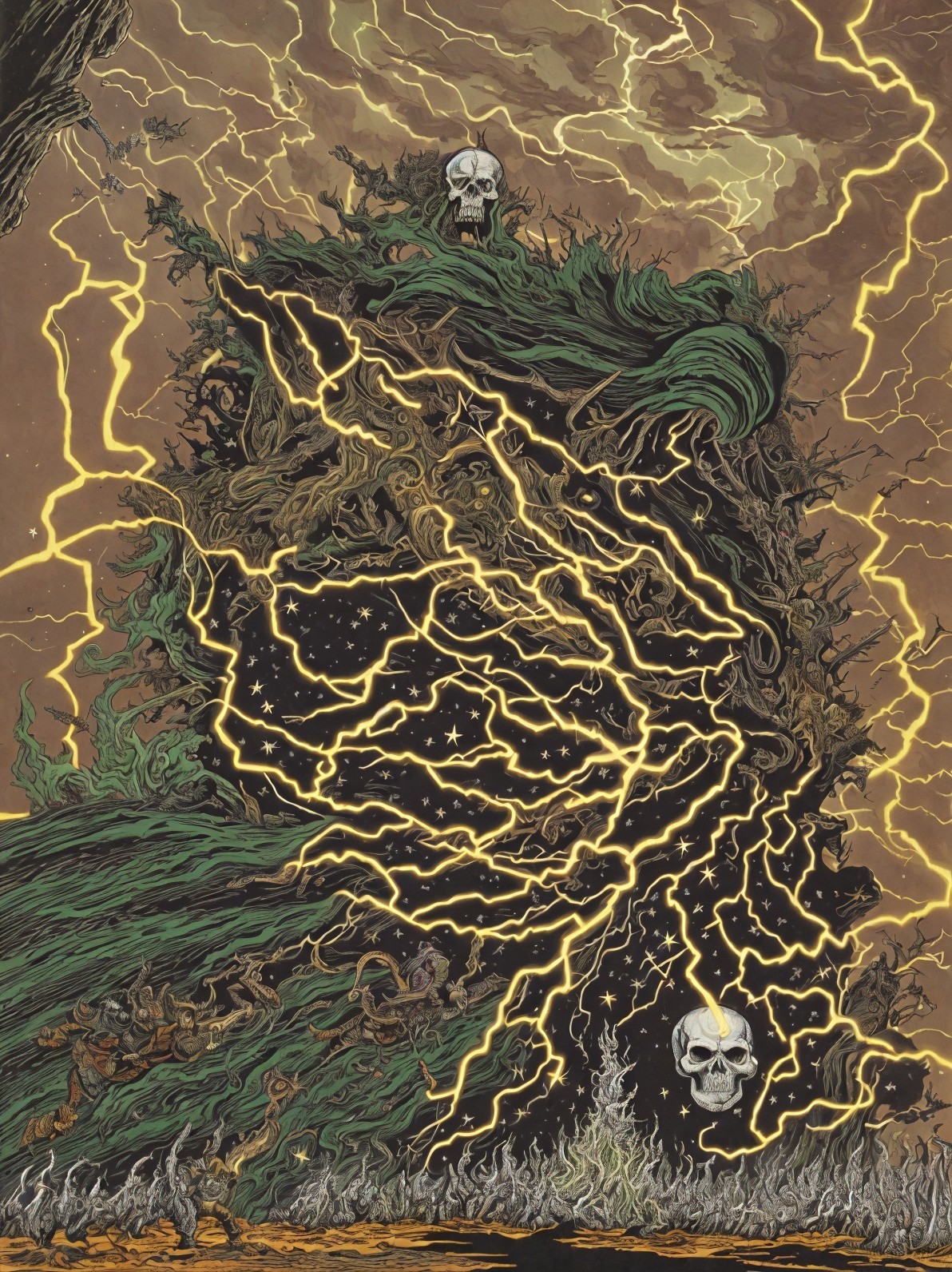 A vivid fantasy illustration depicting a battle scene with armored skeletal figures amidst lightning and swirling magical energies.