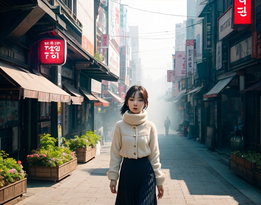 A woman stands in a misty, urban street with Asian signage, wearing a white outfit and black heels.