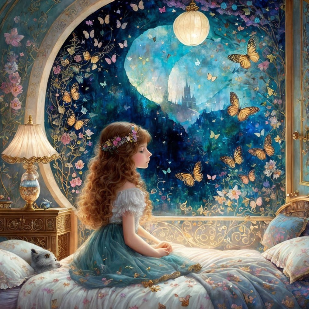 A beautiful lovely young girl in magical fantastic bedroom with whimsical animals, butterflies, fireflies. The bedroom is a portal to the world of dreams. Use the style of Florence Harrison, Yulia Brodskaya, catrin Welz Stein, Rosalba Carriera, pol Ledent, Doug Chinnery, Maud Lewis, Valerie Hegarty, Endre Penovac, Justin Gaffrey. inlay, watercolors and ink, beautiful, fantastic view, extremely detailed, intricate, best quality, highest definition, rich colours. intricate beautiful dynamic lighting award winning fantastic view ultra detailed, 3D high definition hdr