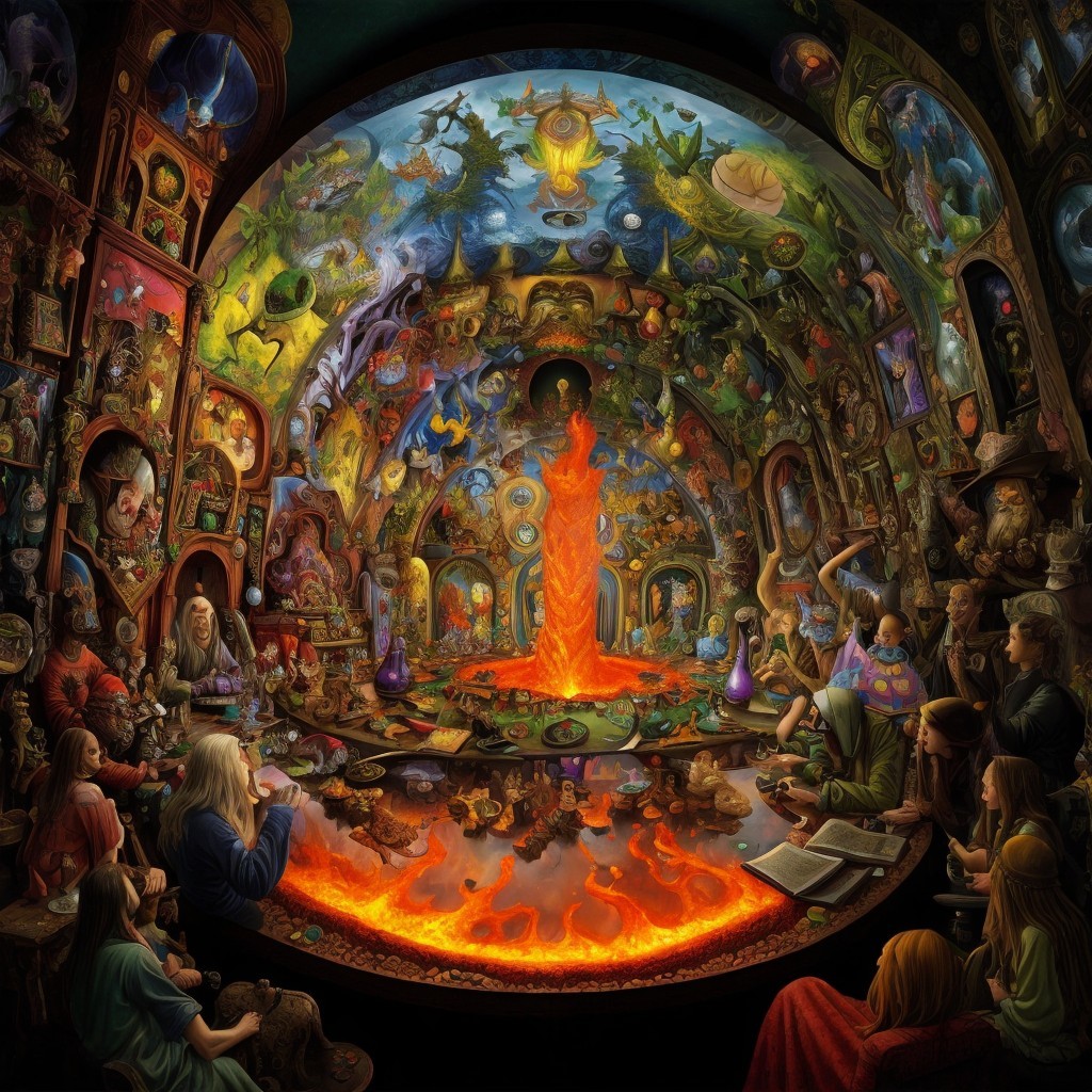 A vibrant, surreal artwork with a central flame, surrounded by figures, celestial bodies, and eclectic objects in an arching, detailed environment.