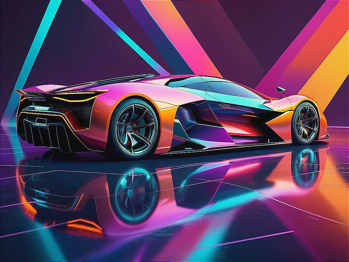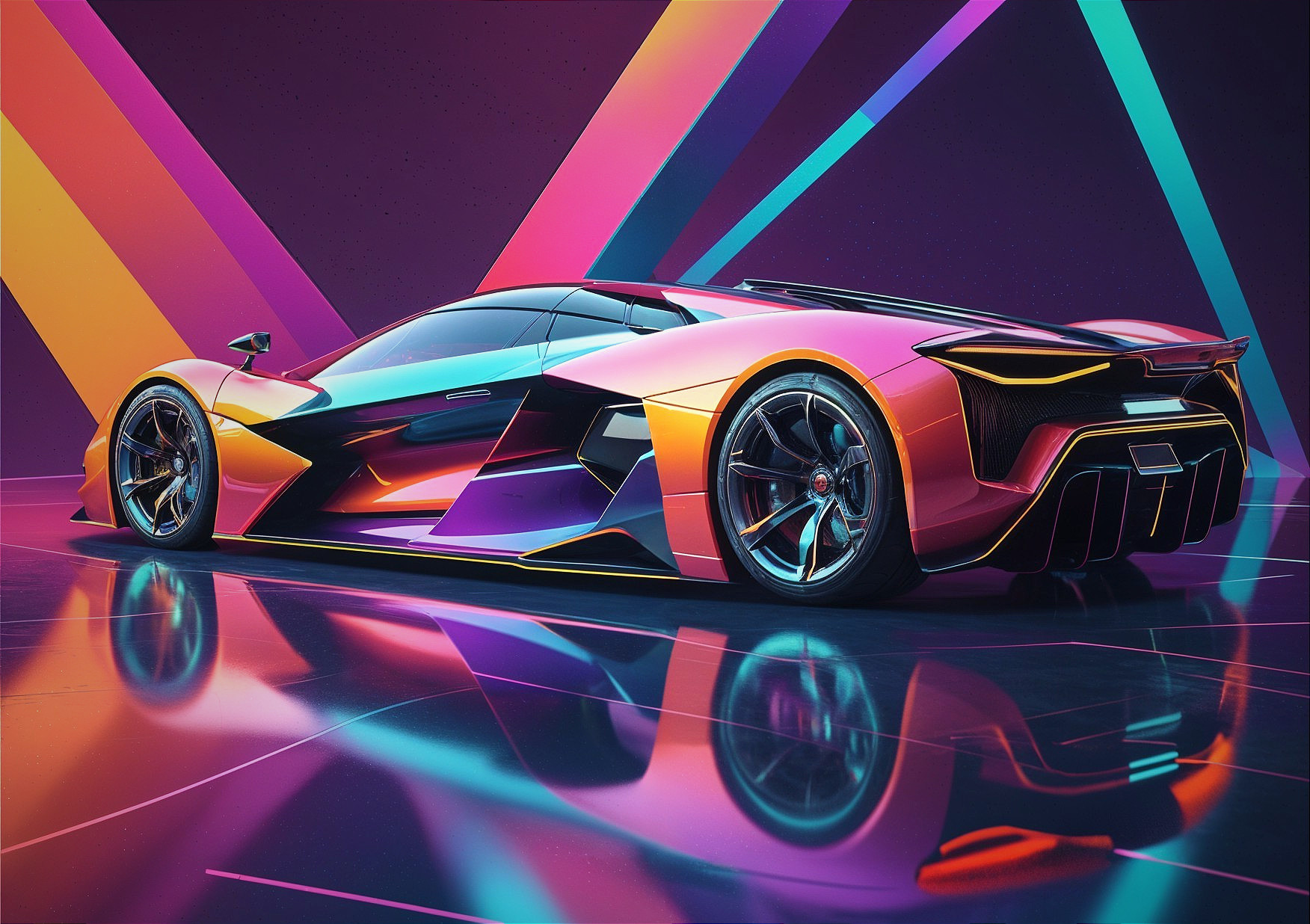 A futuristic supercar with sleek, aerodynamic lines, featuring a vivid gradient of purple, orange, and teal colors. It’s set against a vibrant, angular backdrop, reflecting innovation and speed.