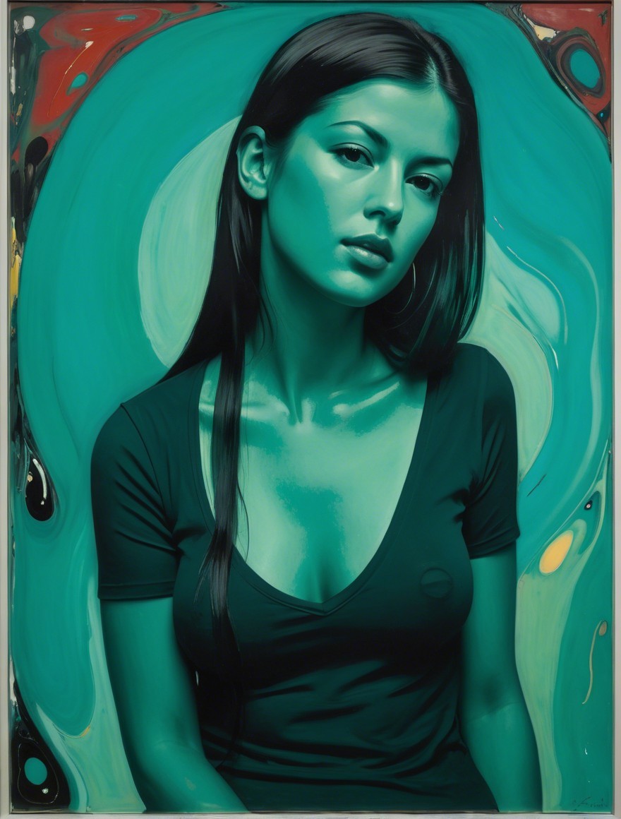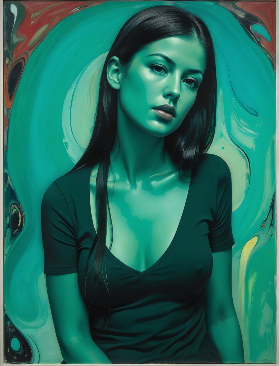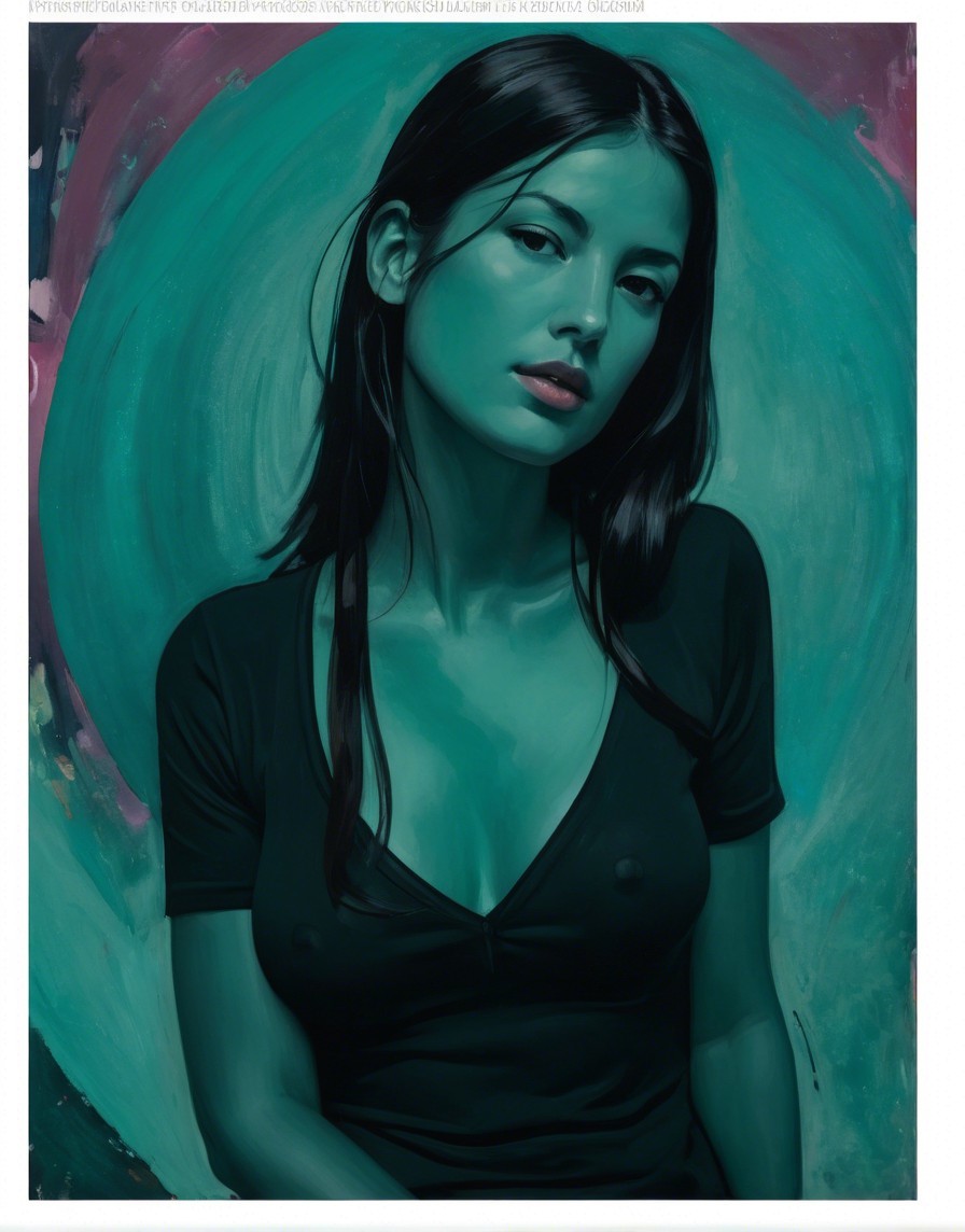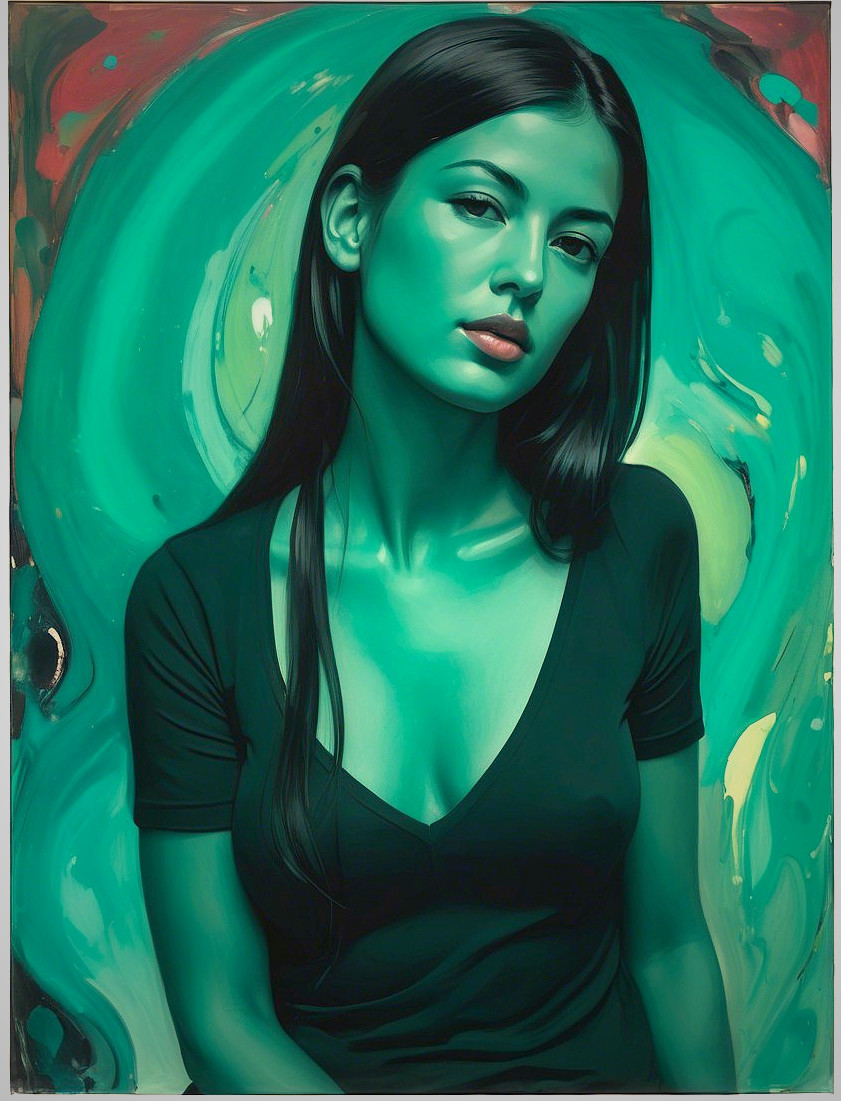 + Prompt:upper body portraiture by Jackson Pollock and Man Ray, thick and bold outlines, serene, complex line-art, encoustic, plasticity 1.6, unique, teal, ligh-black, sea-green, dark-green, color glitches, overspray of thinned gouache, proper, bokeh, debeh, 3 layers of dof, layered, hues by Man Ray, stunned, subsurface scattering 1.4, divisionism, plasticity 1.3, complexion 1.1, futuristic gradient inking, Takashi Murakami and Camille Rose Garcia inspired, high contrast, sharp lines, exaggerated features, cel-shading techniques by William Bradley, infusing the scene with dynamic and VFX-inspired softened lighting, cel-shading techniques by William Bradley, textured layers, painterly elements, glossy finish, HDR, reflections, rim lighting, parallax occlusion 1.3, angled view showcasing colorful dyed hair, LiDAR point cloud, negative lucas numbers, sawtooth wave, seductive expression, matte obsidian eyeshadow, custom_loss: grey, muted tones in background, vibrant, conceptual, joyful, 3 point lighting, expressive, strict, line-art features,