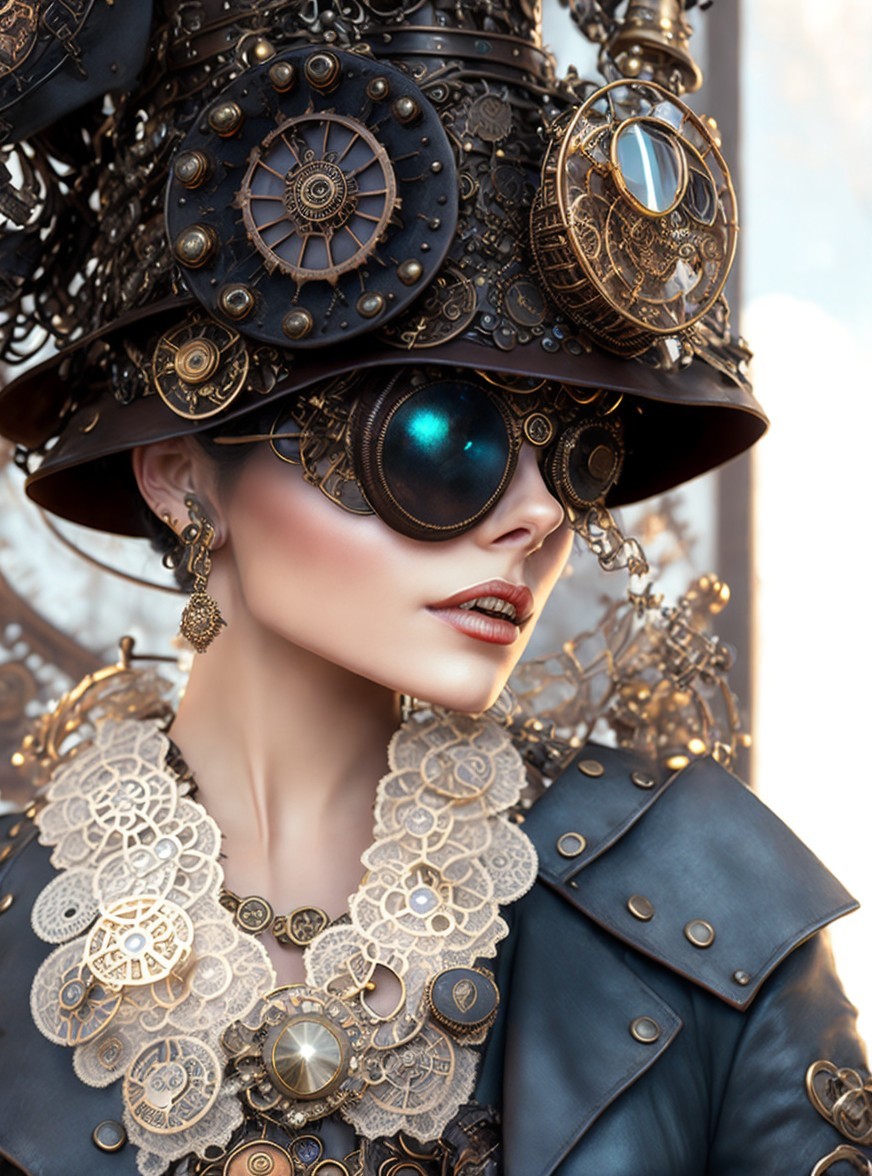 A striking steampunk-inspired figure dons elaborate goggles and a gear-laden hat, complemented by a bold leather outfit and an ornate necklace made of intricate clockwork elements.