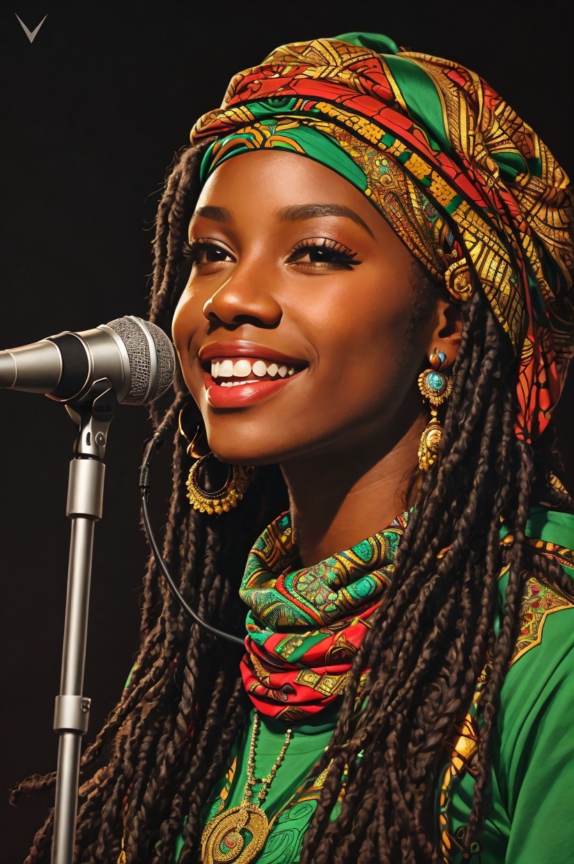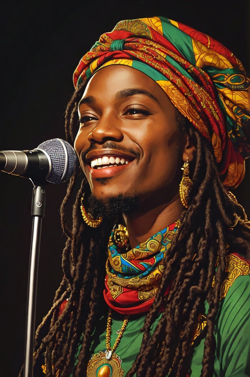 + Prompt:Vector T-shirt Design Ready To Print Illustration Side Profile Of A Rastafari Soul Singer With African Headscarf, Smile, Dreadlocks, In Front of A Microphone, Vector Intricately Detailed Art Inspired by Aleksei Vinogradov, Rafael Santi and Kelly Freas, Clear White Background