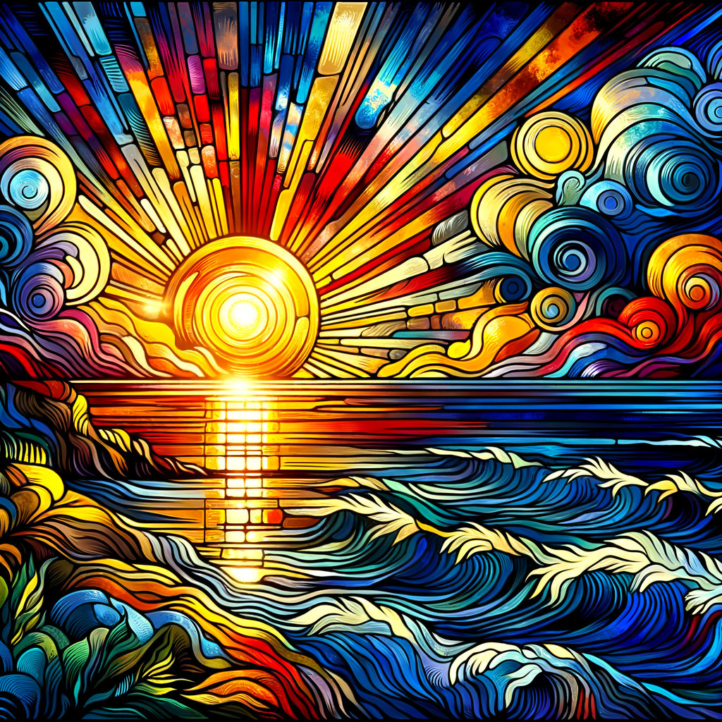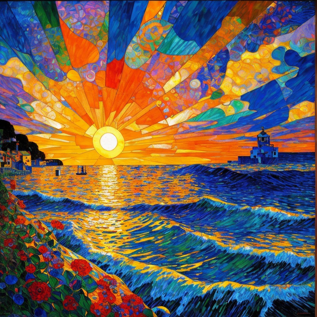 A vivid mosaic-style painting of a sunset with radiant sun rays over a wavy sea, bordered by a flower-lined cliff.