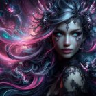 A vibrant portrait of a woman with striking blue and pink hair, adorned with colorful accessories. Her expressive eyes and bold makeup create a captivating, ethereal look.