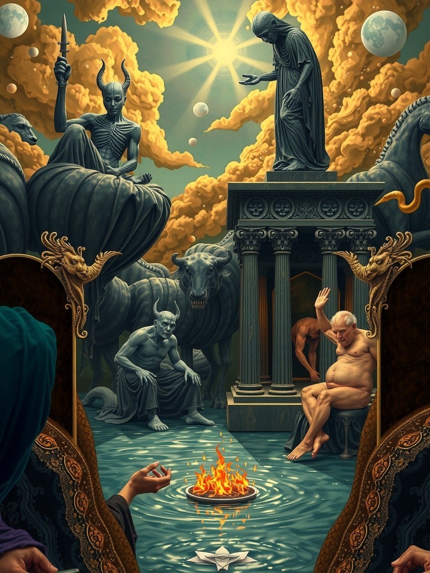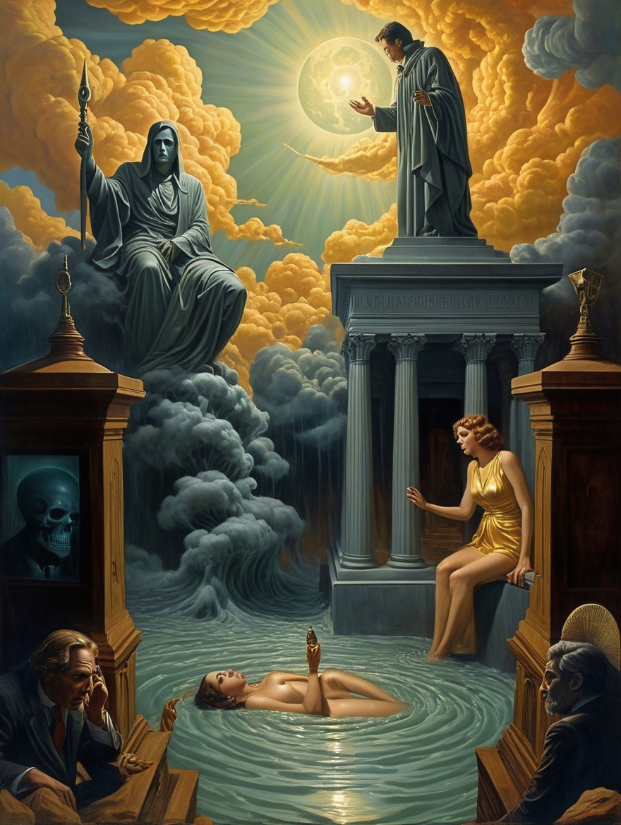 Surreal Scene with Moon, Water, and Neoclassical Elements