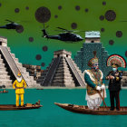 Surreal Scene with Pyramids, Helicopters, and Boats