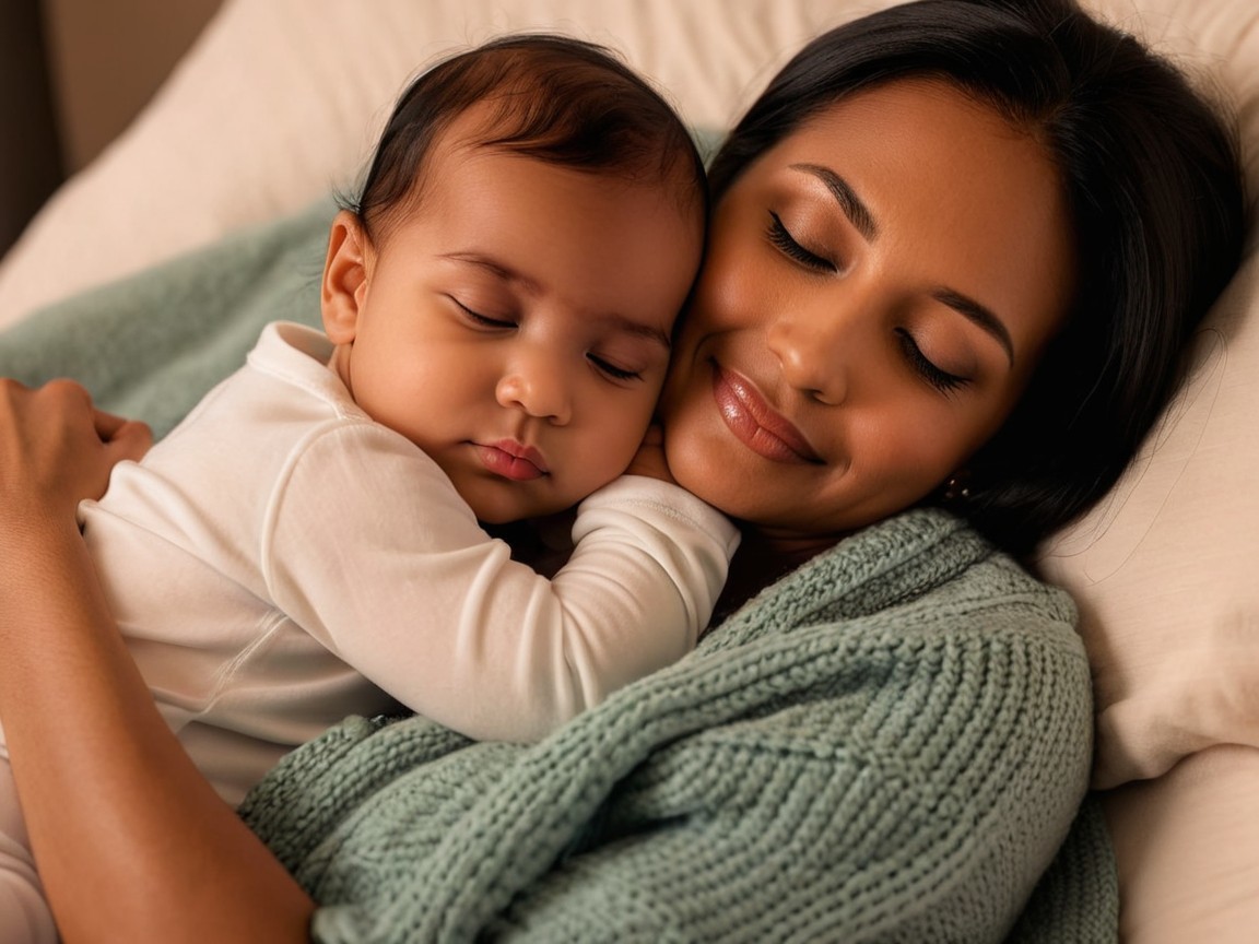 A serene moment captures a mother gently cradling her baby, both displaying peaceful expressions. They are wrapped in a cozy blanket, exuding warmth and love in a soft, inviting setting.