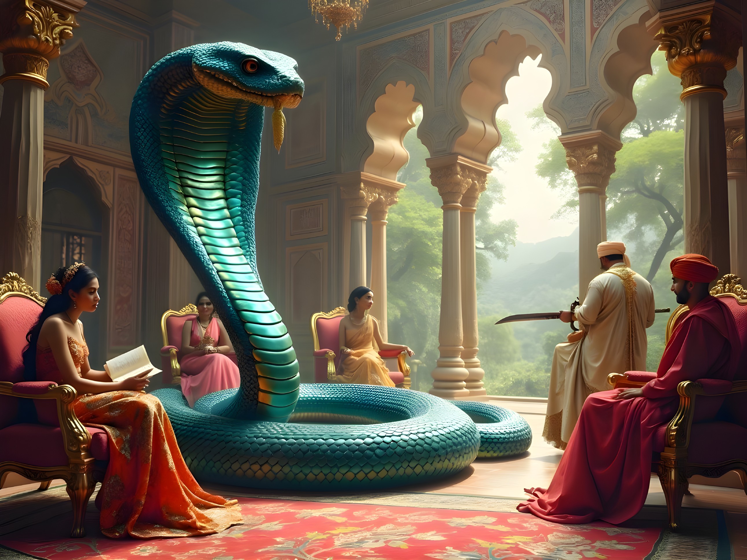 In an opulent palace, a majestic blue snake coils in the center, surrounded by elegantly dressed figures. Two women sit reading, while a man in traditional attire wields a sword.