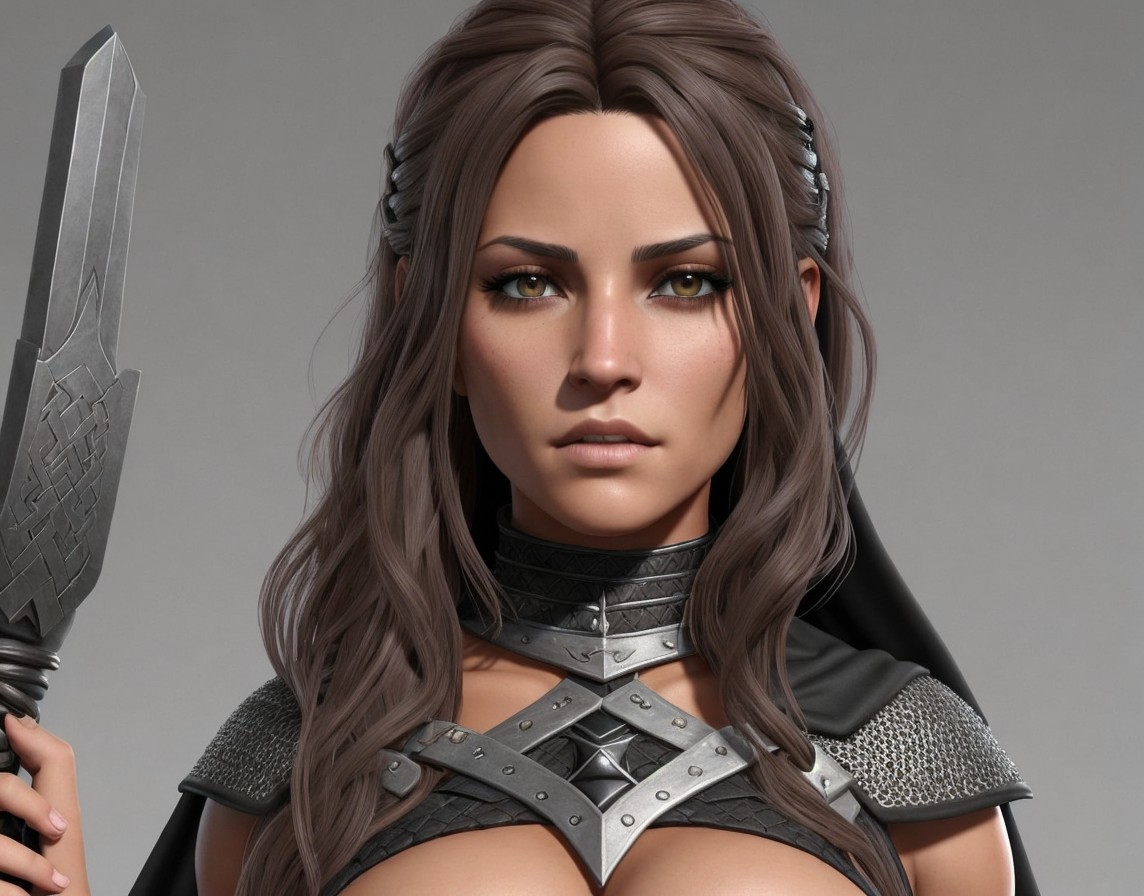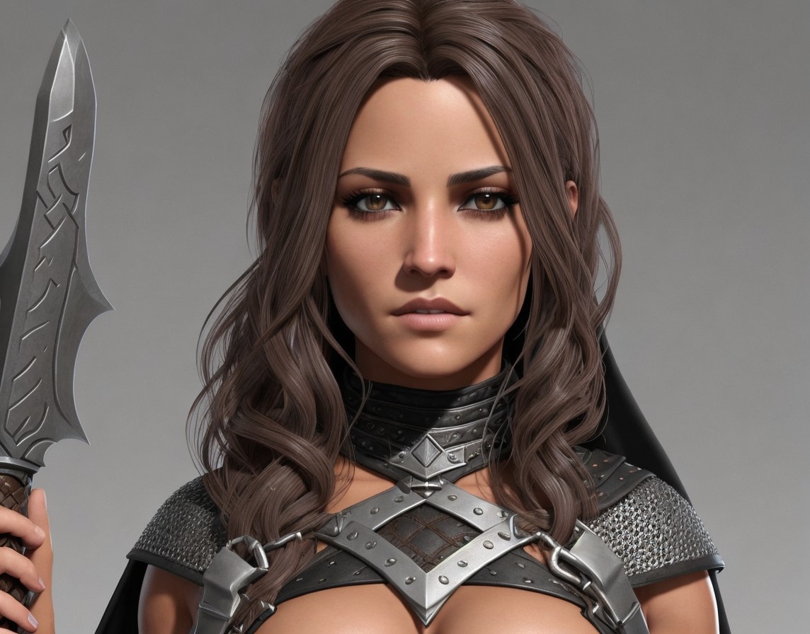 A digital artwork of a female warrior with brown hair, intense gaze, holding a sword, clad in metal armor with chainmail on a grey backdrop.