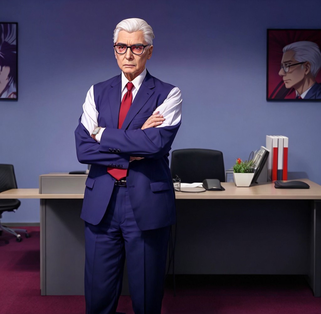 + Prompt:Elderly male anime character with slicked-back white hair, narrow red eyes, and thin glasses, standing with crossed arms, wearing a sharp navy blue suit with a red tie and white shirt, in an office setting with purple walls and modern furniture.