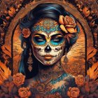 The image features a woman with intricate face paint resembling a calavera, adorned with vibrant flowers and an ornate necklace. Her striking eyes and colorful details evoke a festive, cultural celebration.