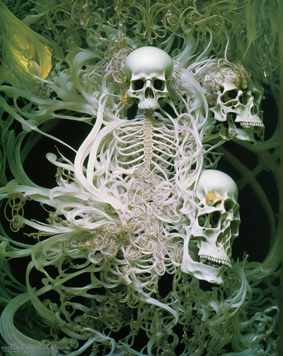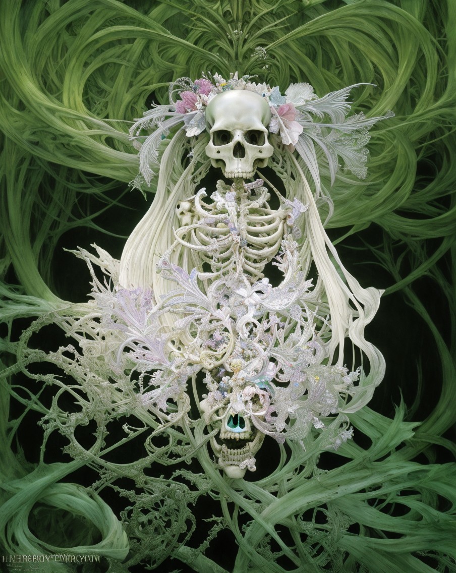A regal figure in white with an ornate headdress sits before a gothic window, emanating an ethereal aura with mechanical elements. Other-worldly image by constance lowery.