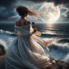 A woman in a flowing silver dress stands by the ocean, gazing at a vibrant planet-like orb with surreal colors, against a dramatic backdrop of waves and a luminous moonlit sky.
