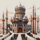 A bioreal landscape features a tall, glittering structure with intertwining spires and spheres against a pastel sky, alongside a figure standing poised atop the sandy terrain.