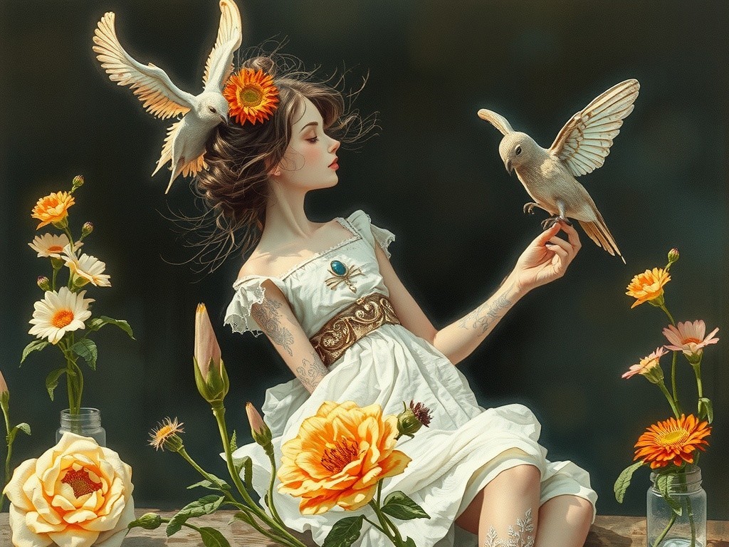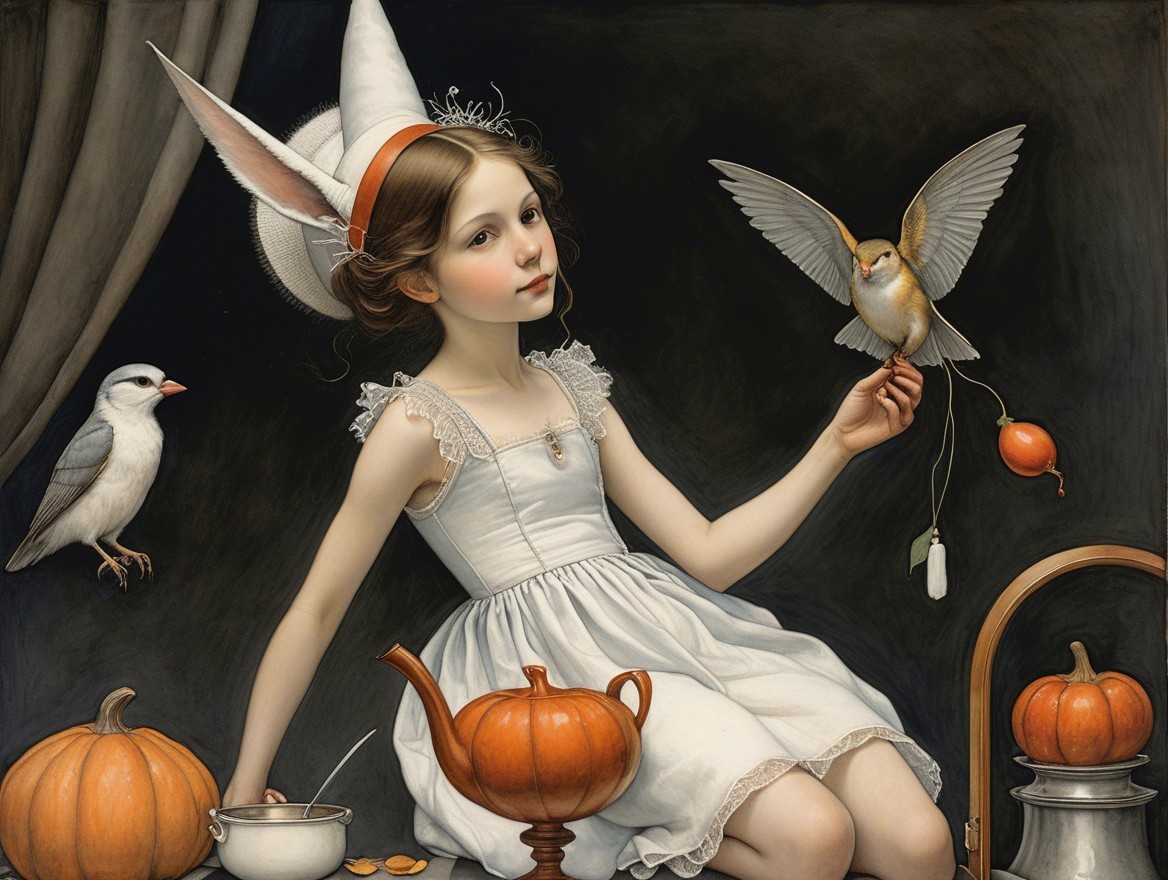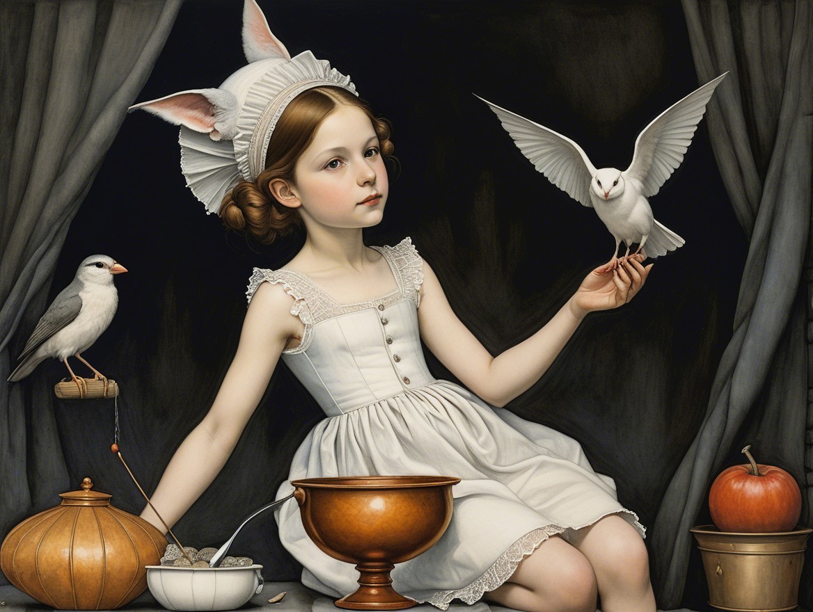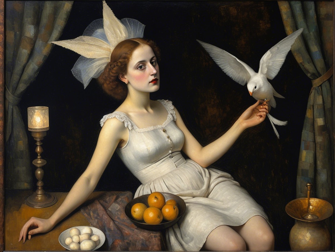 A young woman in an elegant, light-colored gown sits gracefully at a table, holding a lamp. Her serene expression and vintage style exude a sense of nostalgia and charm against a dark, patterned background.