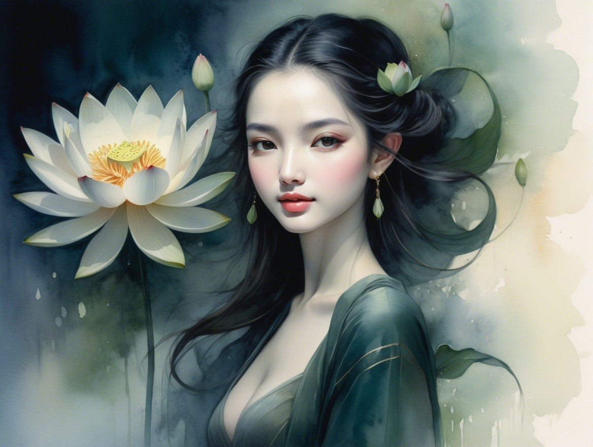 A serene portrait of a young woman with long dark hair, adorned with lotus flowers and wearing elegant attire. The soft colors and delicate details evoke a tranquil, ethereal vibe.