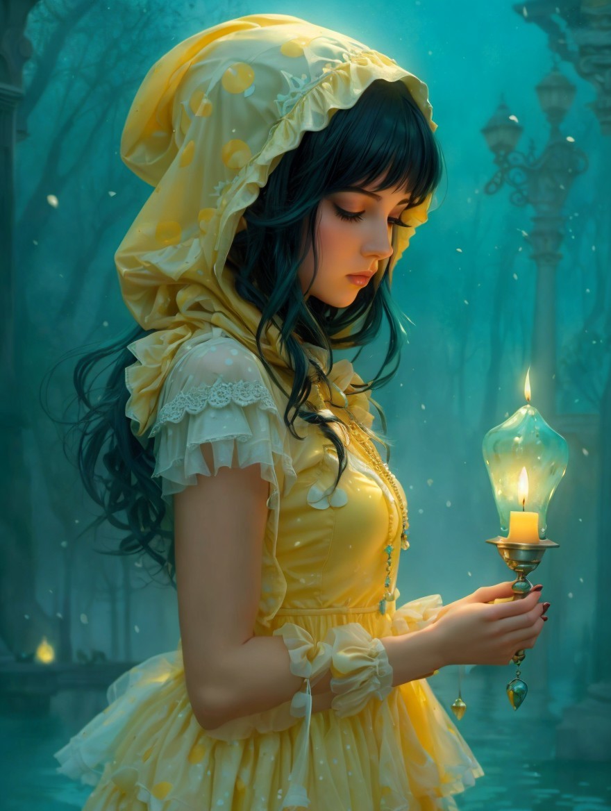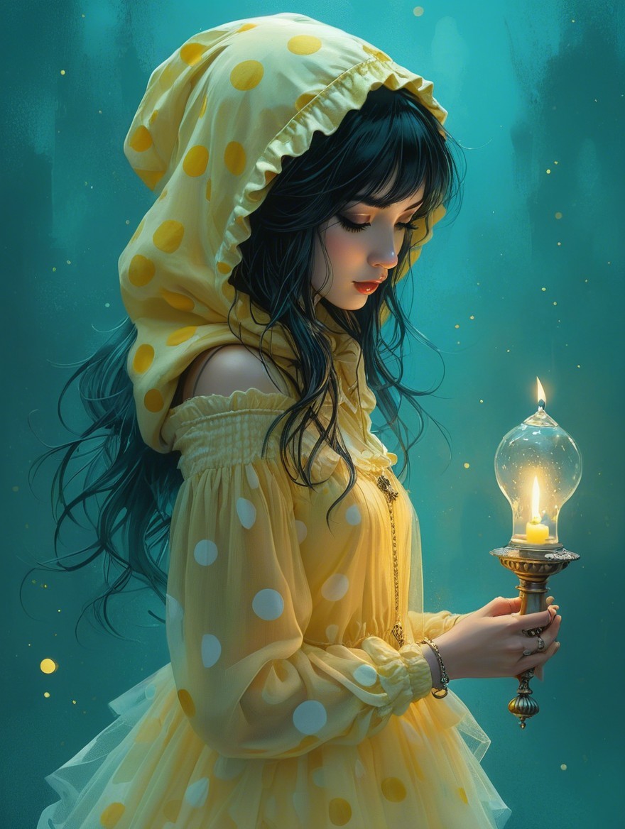 A young woman in a yellow polka-dot dress and hood holds a glowing lantern. She stands in a misty, enchanted forest, with soft light illuminating her serene expression.