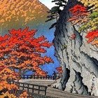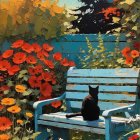 A black cat sits on a weathered blue bench, gazing at a bright sunset. Surrounding it are vibrant orange poppies and lush greenery, creating a serene garden atmosphere. Prompt by Deborah J Huber. Thanks!