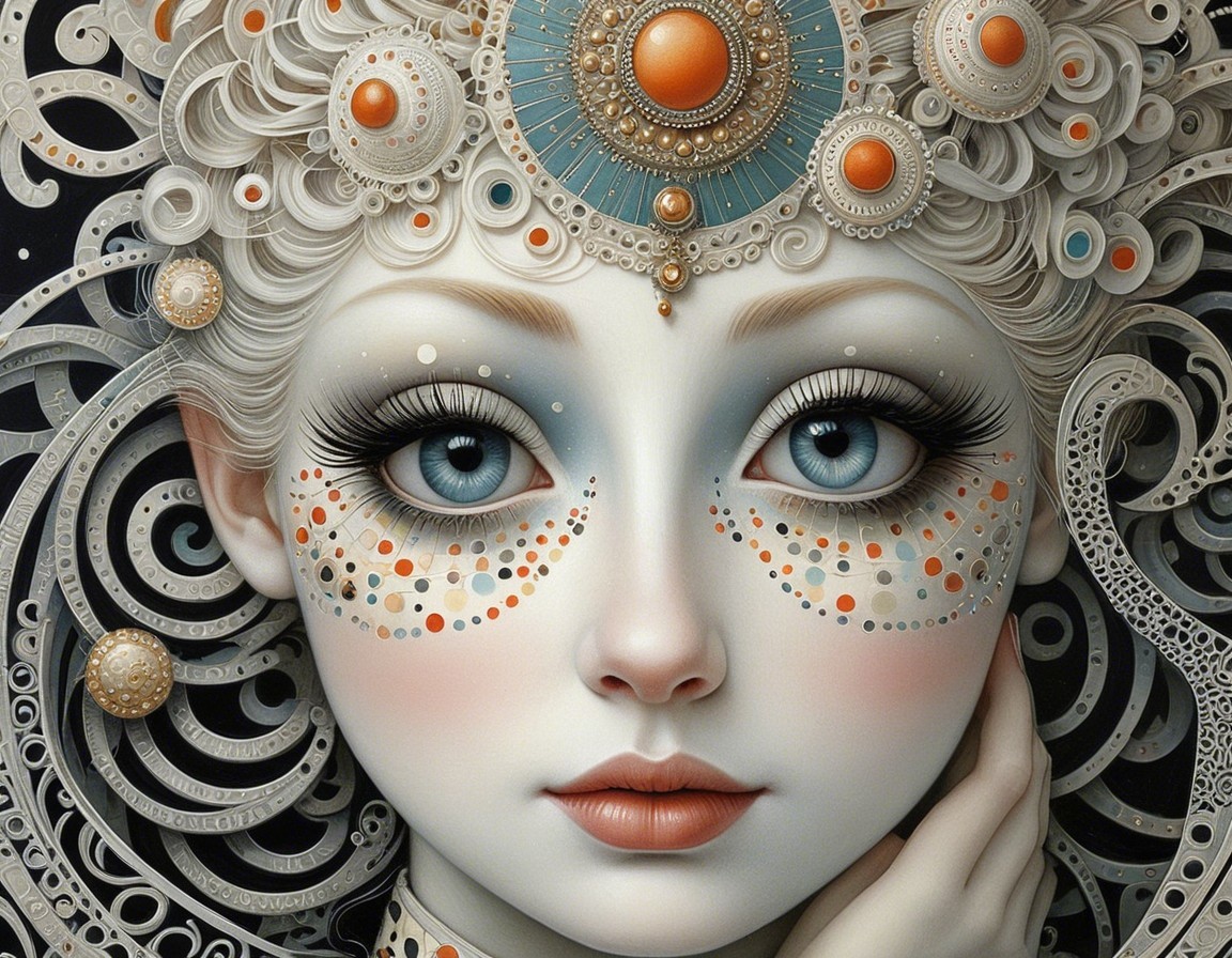 The artwork features a captivating portrait of a young woman with striking blue eyes, adorned in intricate silver and pearl decorations, showcasing a blend of elegance and ethereal beauty.