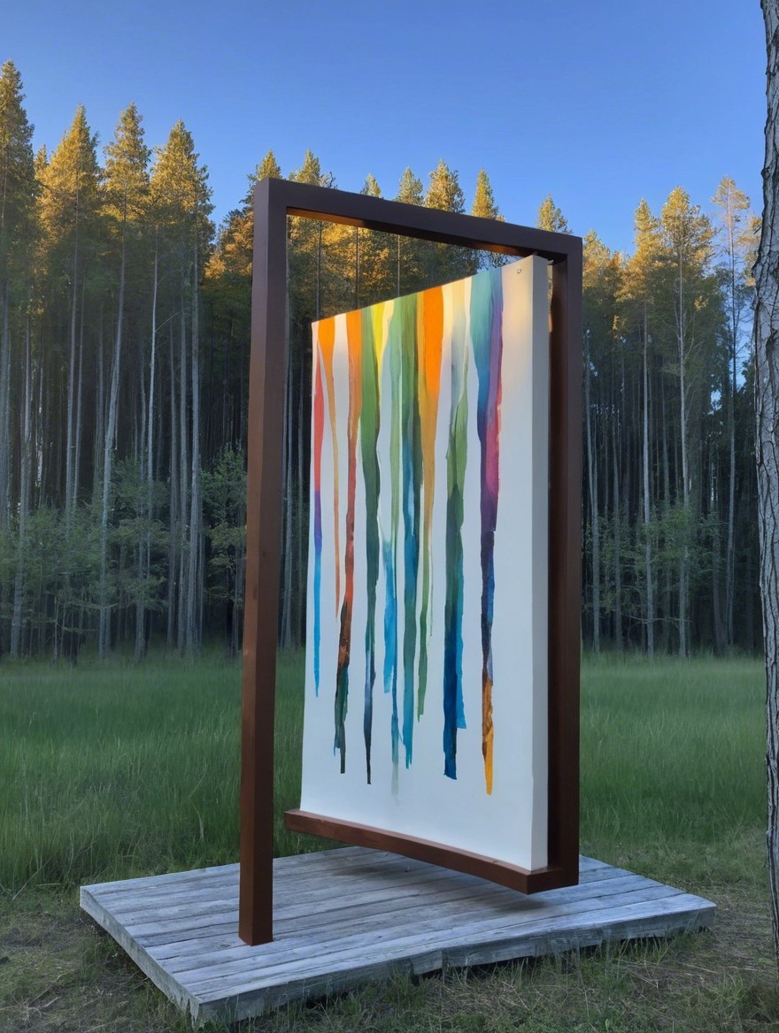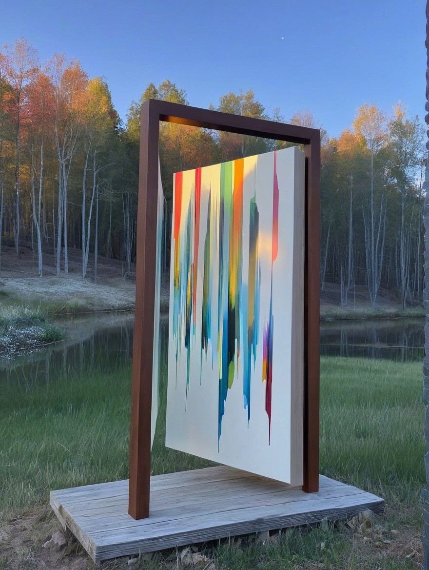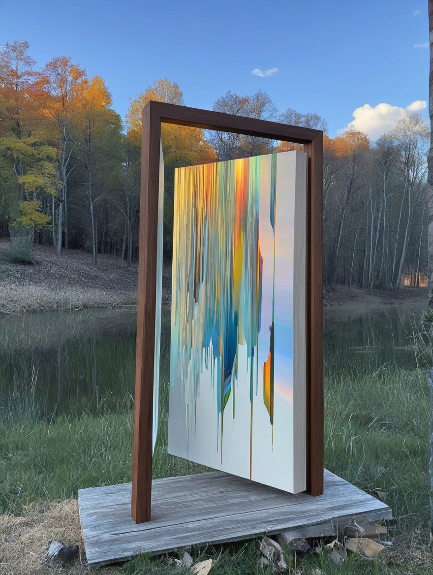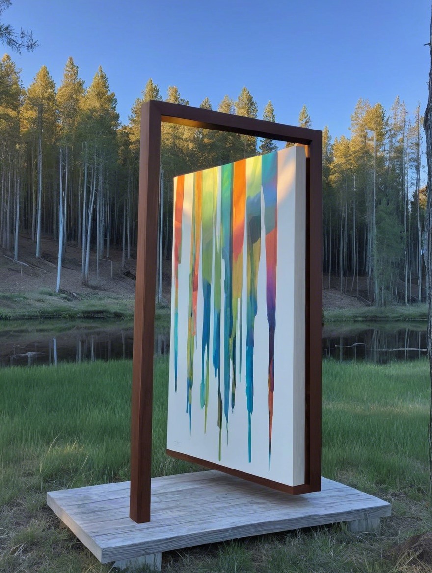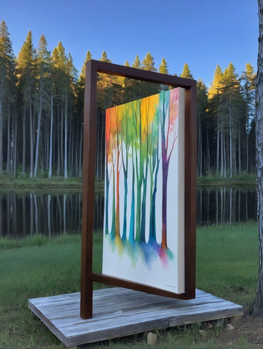 A large, decorative mirror stands in a serene landscape, reflecting colorful trees next to a still lake, framed by tall pine trees that tower in the background under a clear blue sky.