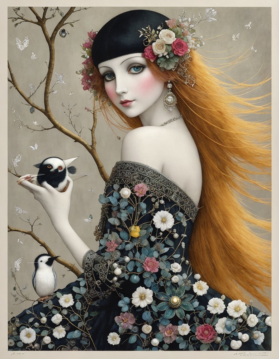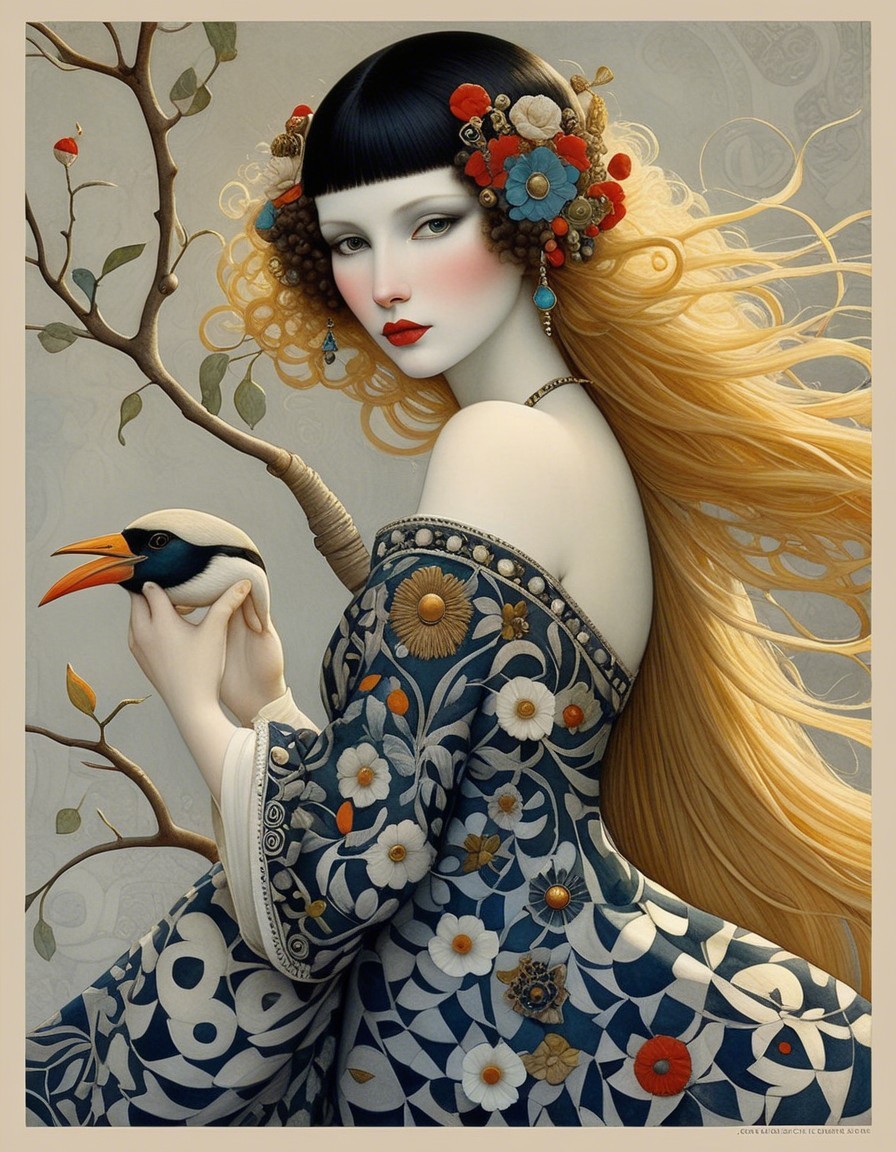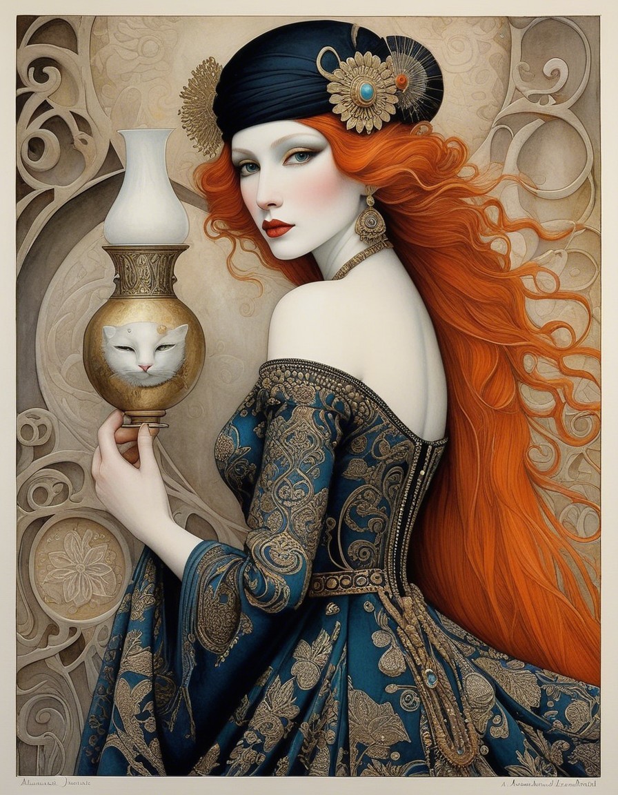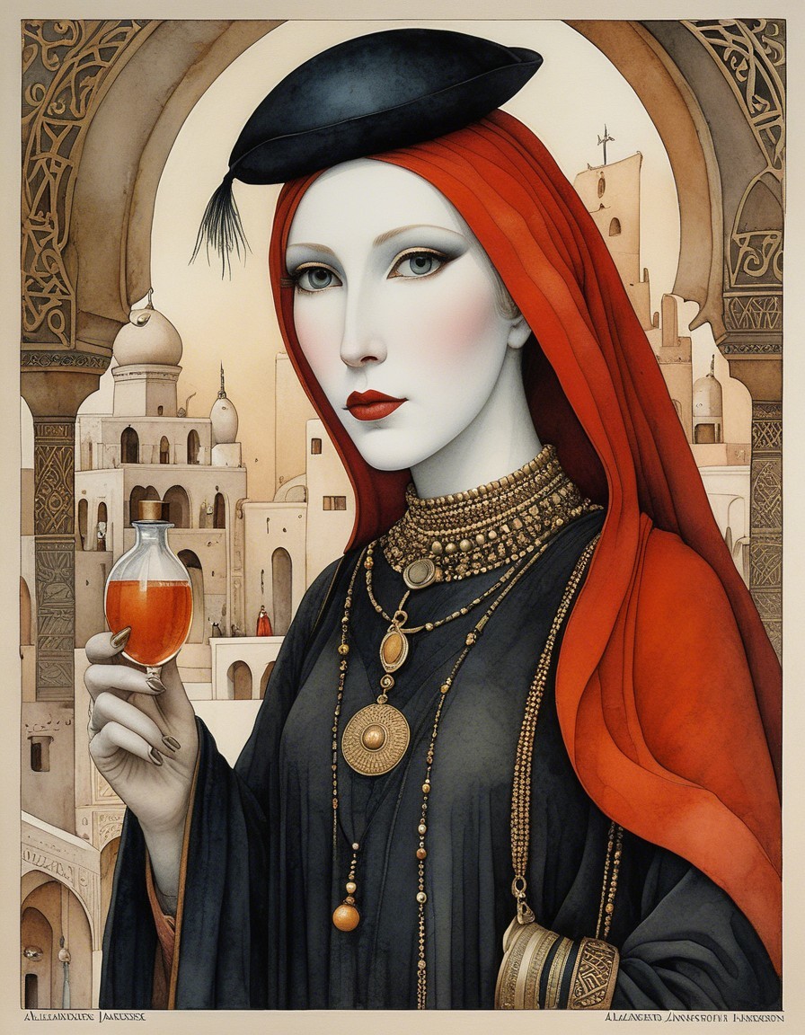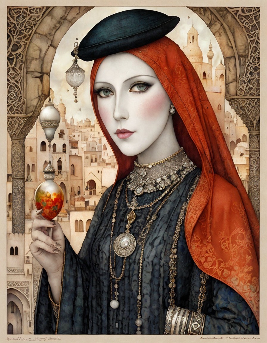The artwork features a woman dressed in a dark robe adorned with intricate jewelry and a flowing red headscarf, holding a small ornate vessel against a backdrop of architectural arches.
