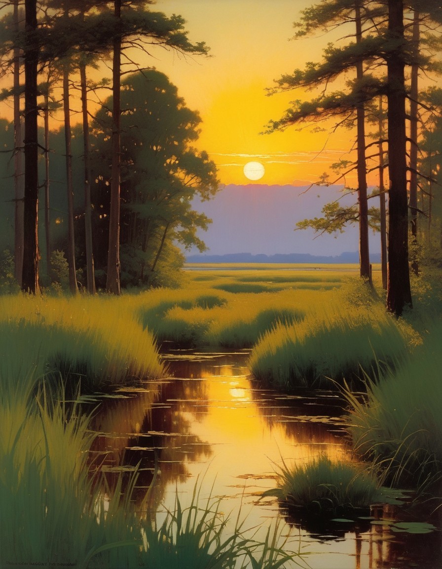 Prompt: Create a luminescent landscape painting depicting a marsh in the summertime woods at the golden hour, when the trees appear to glow with an amber amber light.