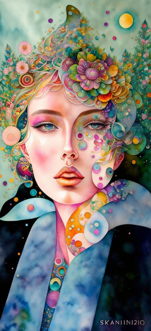 Colorful woman illustration with floral and cosmic motifs blending harmoniously.