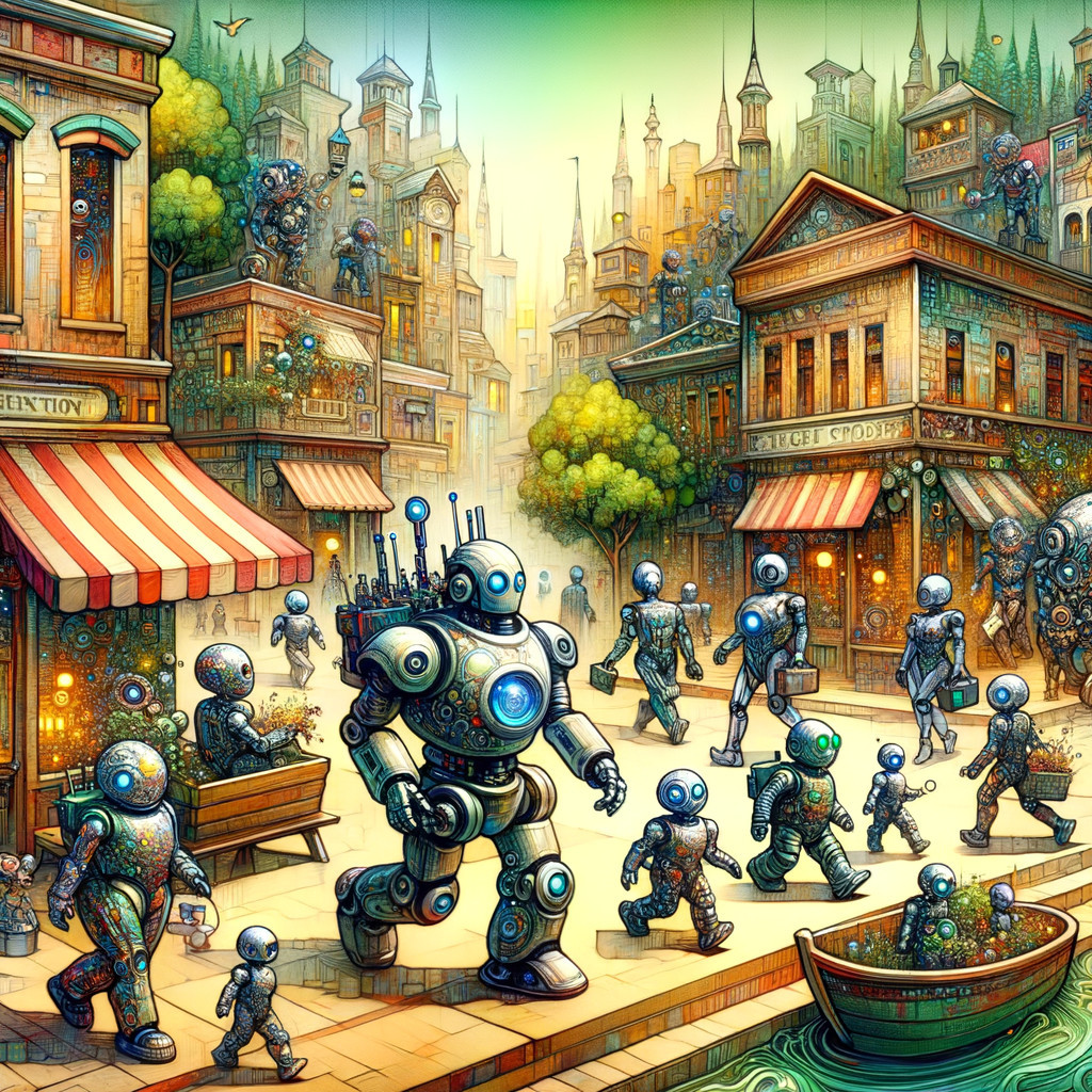 Colorful urban scene with robots who have been released from the factory where they were manufactured.