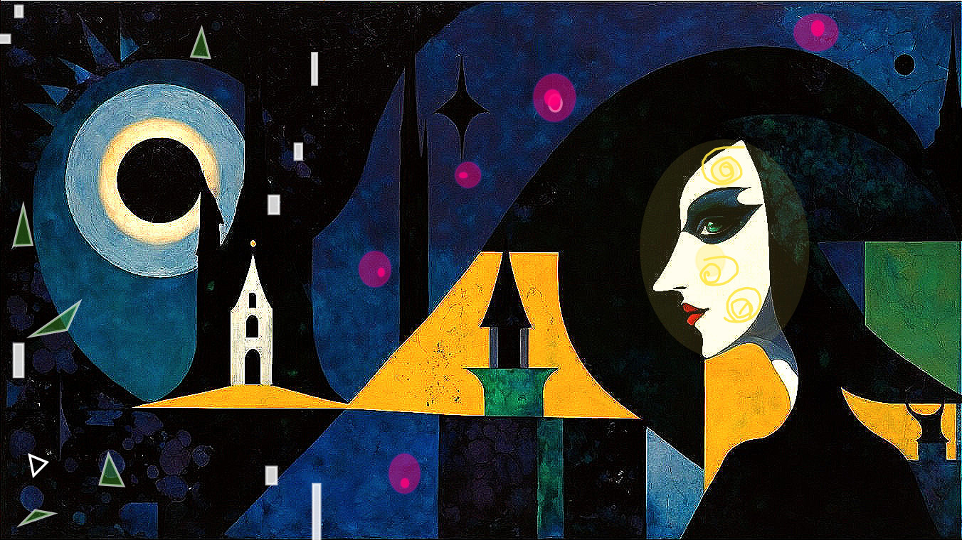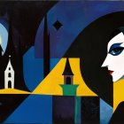 The artwork features a stylized woman with striking green eyes, set against a dark, moonlit landscape. Abstract buildings and celestial bodies enhance its mysterious, dreamlike atmosphere.