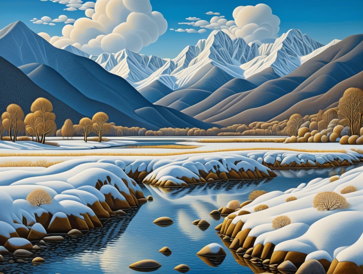 A peaceful winter landscape of snow-covered mountains, a river reflecting the sky, and golden trees dotting the banks, in a cubist style.