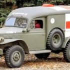 A vintage 1942 Dodge WC-54 military ambulance with a rounded shape, painted in olive green. It features a prominent red cross emblem on the side, set against a natural backdrop of trees and grass.