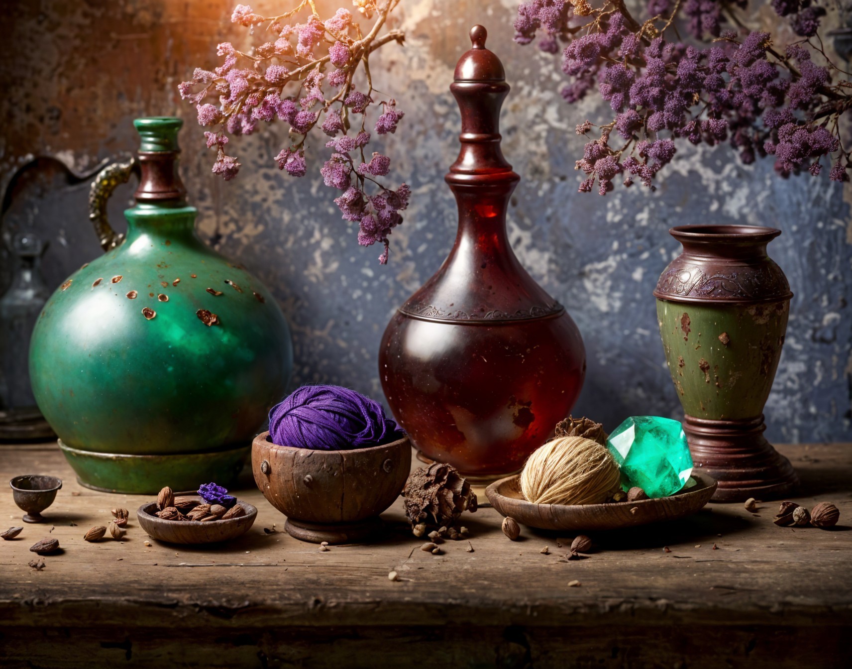 Prompt: "Collection of items on a dirty dusty old wooden table, in a dark old country kitchen. There is (ONE dried-up desicated rose), (a dirty emerald-encrusted goblet), (a broken dark-blue ceramic-wine-decanter)], some nuts, a ball of brown yarn, some rusty thimbles, a grey and dark-purple dirty-old-book, a rusty-antique-iron, and an old smoking-pipe. In the style of Caravaggio."