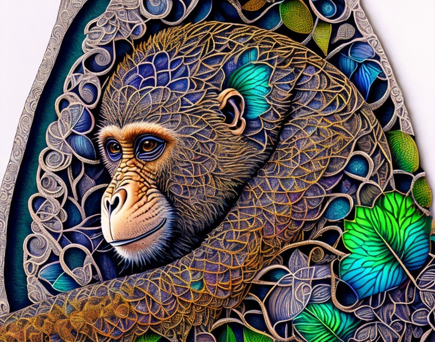 Prompt: create an image of a monkey on fractalized zentangle vine climbing a stone wall, fall color scheme, professional coloring book style
