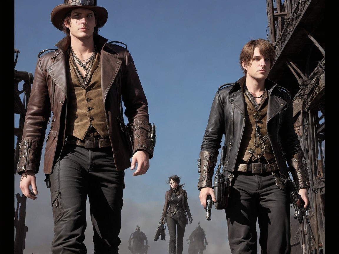Three characters dressed in rugged, steampunk-inspired outfits stride confidently through a dusty landscape, exuding a sense of adventure and danger, with futuristic weapons at their sides.