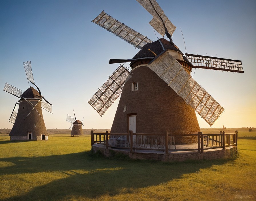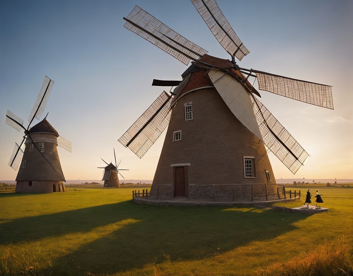 A tranquil scene with three traditional windmills and a person in white clothing enjoying a sunset in a pastoral setting.