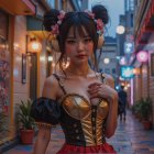 A striking figure stands at a gate adorned with skulls, wearing a red devil-inspired outfit with horns and wings. The sunset casts a warm glow, enhancing the mysterious, captivating atmosphere.