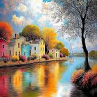 A vibrant autumn scene depicting a serene lake reflecting colorful trees and a quaint house. The sun rises, casting warm hues across the sky, creating a peaceful, picturesque atmosphere.